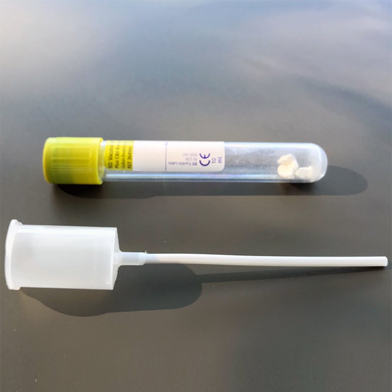 Flacon en plastique à bouchon rouge, prélever au minimum une « noix» de selles dures ou 20 ml de selles liquides à transmettre dans les plus brefs délais.